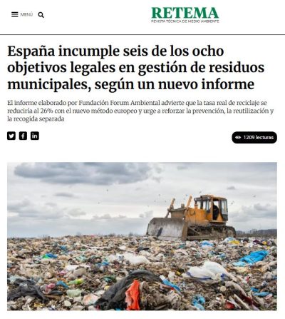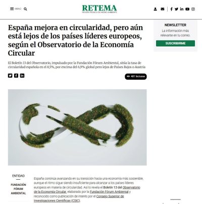 Según refleja el último boletín del Observatorio de la Economía Circular elaborado por la Fundación Fórum Ambiental, la tasa de circularidad en nuestro país se sitúa en el 8,5%. [Más +]