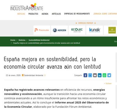 España ha registrado avances relevantes en eficiencia de recursos, energías renovables y ecoinnovación, aunque la transición hacia una economía circular continúa avanzando a un ritmo insuficiente para afrontar los retos económicos y ambientales actuales. Así lo concluye el Informe anual 2025 del Observatorio de la Economía Circular, elaborado por la Fundación Fórum Ambiental. [Más +]